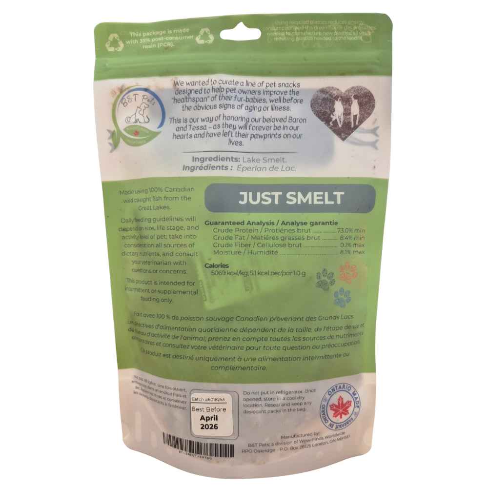 Treat your pup to a taste of the wild with B&T Just Smelt — nutrient-rich, all-natural fish treats made from 100% wild-caught smelt. Fresh from the waters of Lake Erie, farmed and harvested using sustainable practices, and a proud Product of Canada.
