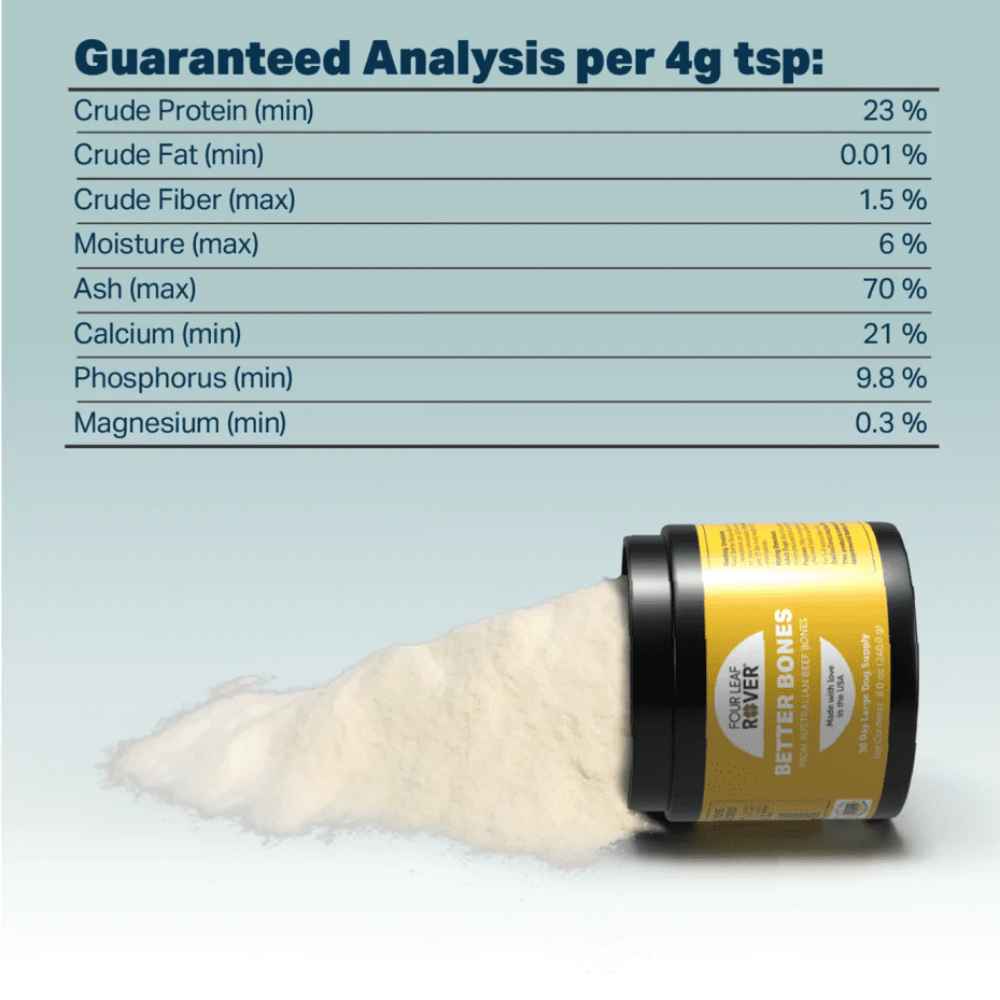 For Adult Dogs: For pound of home-prepared meal, mix in 2 teaspoons of Better Bones, or as directed by your veterinarian. The amount of Better Bones to feed depends on the amount of fat in the food. Follow the directions below.