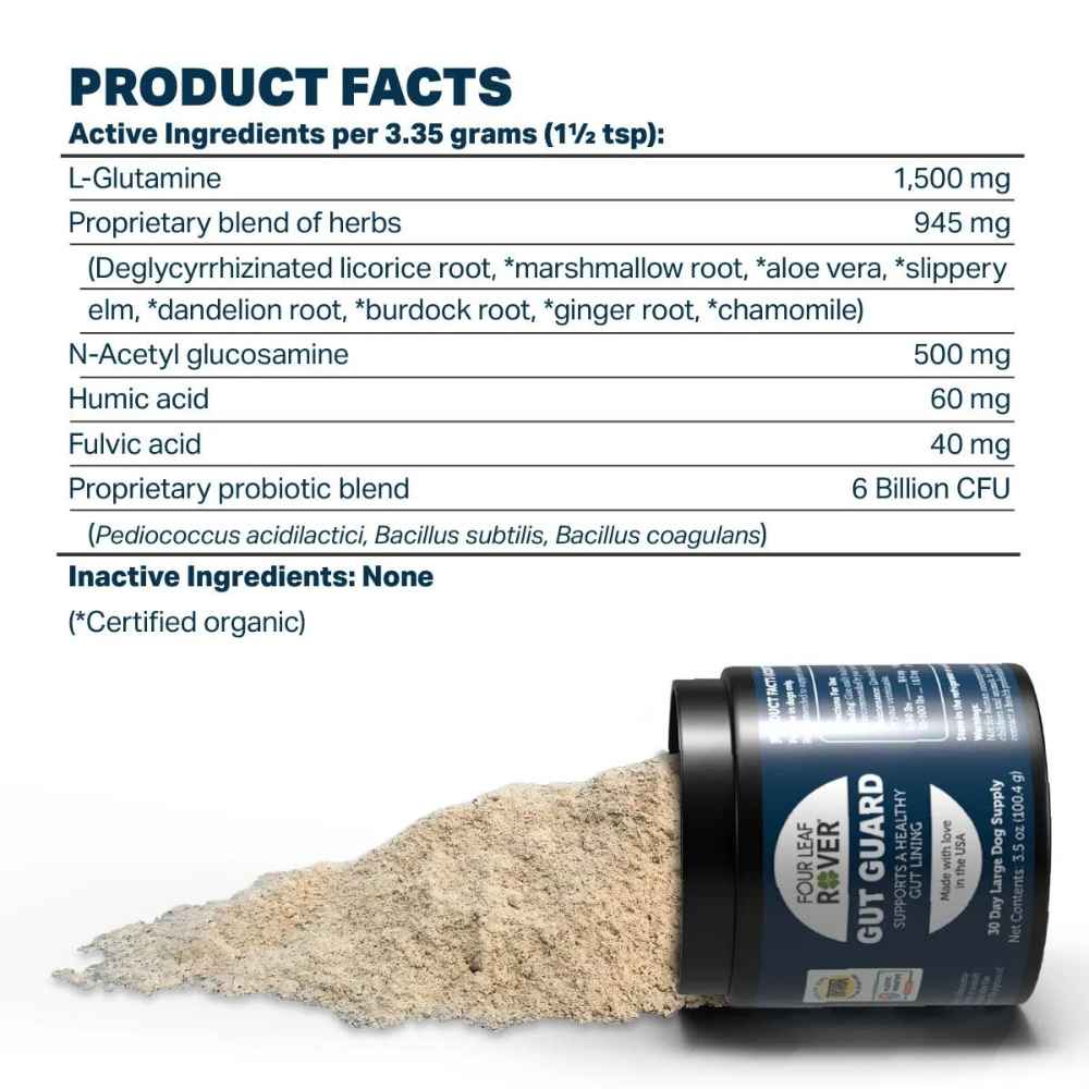 Four Leaf Rover Gut Guard is a veterinary formulated blend of soil-based probiotics and organic herbs that support a healthy gut lining.