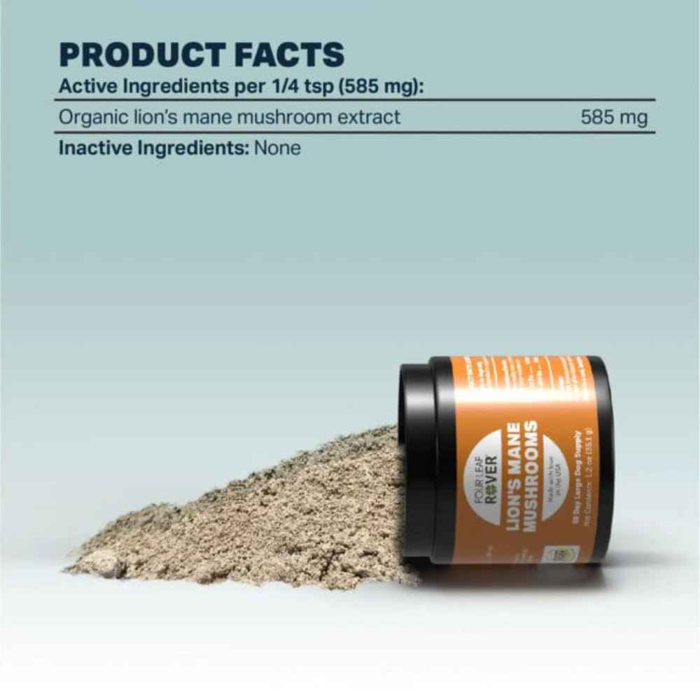 Four Leaf Rover Lion’s Mane Mushroom is another addition to Four Leaf Rover’s powerful lineup of mushroom products, a gut-friendly source of beta-glucans with a long list of benefits for senior dogs, dogs with anxiety, overweight dogs, and more. Lion’s Mane is a gut-friendly way to help dogs maintain a consistent weight and supports a normal blood sugar levels for dogs with diabetes.