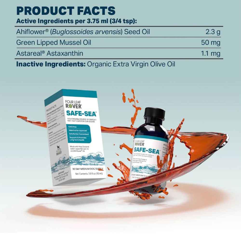 Four Leaf Rover Safe-Sea Green Lipped Mussel Oil is a sustainable and healthy combination of New Zealand Green Lipped Mussel Oil and Ahiflower. No fillers, no heat processing.