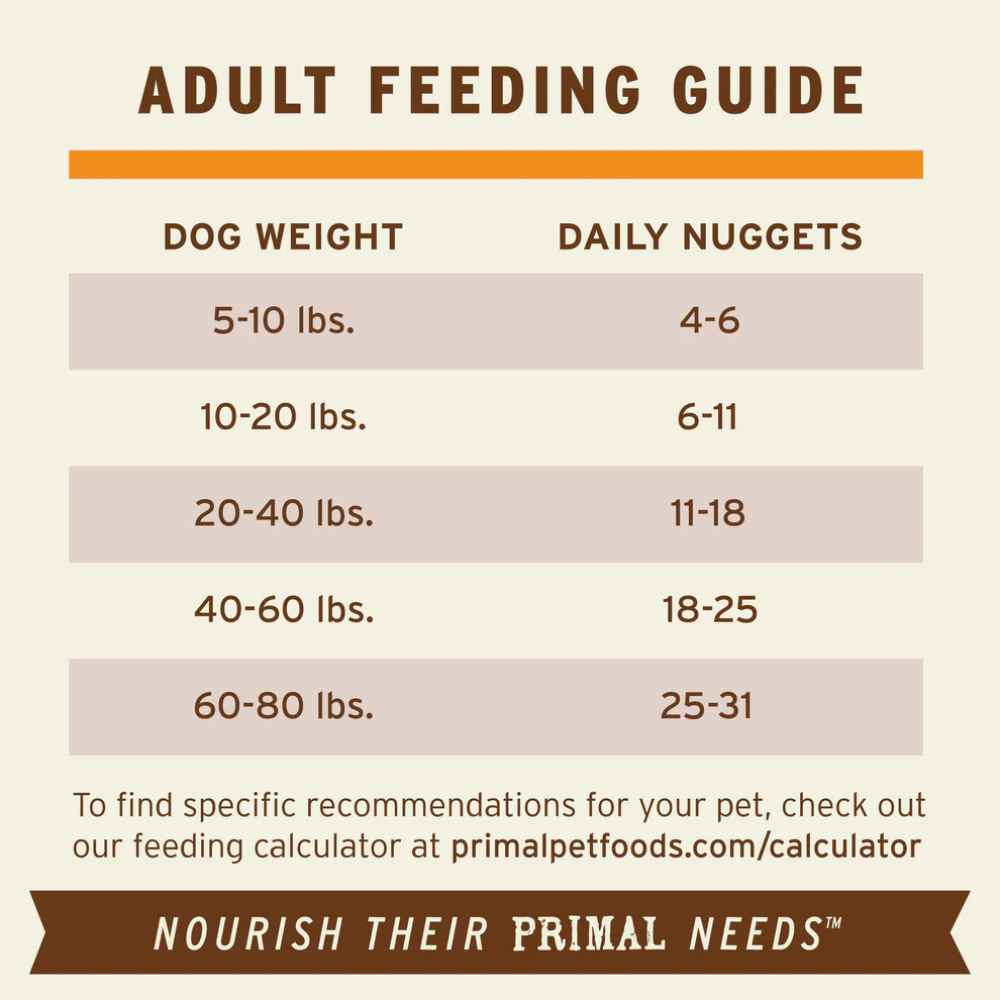 Rehydrate food with warm water, Primal Bone Broth, or Primal Raw Goat Milk to ensure optimum nutrient absorption. We recommend thoroughly incorporating one tablespoon of hydration for every nugget served.